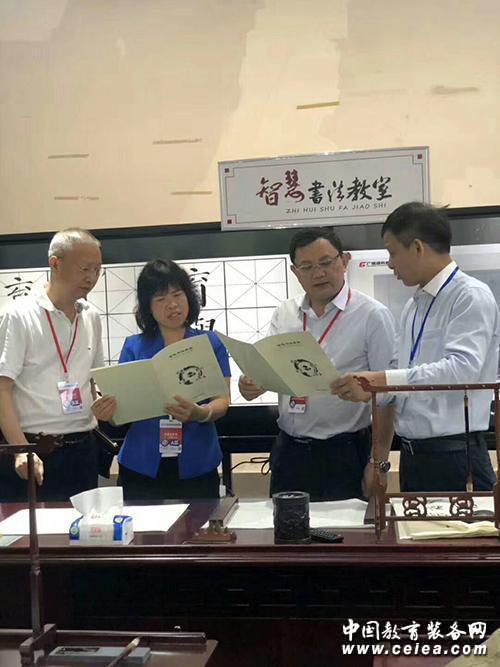 廣視通陳登貴董事長向華南師范大學(xué)王恩科校長、馬衛(wèi)華副校長、科技處聶瑞華處長詳細介紹智慧書法教室
