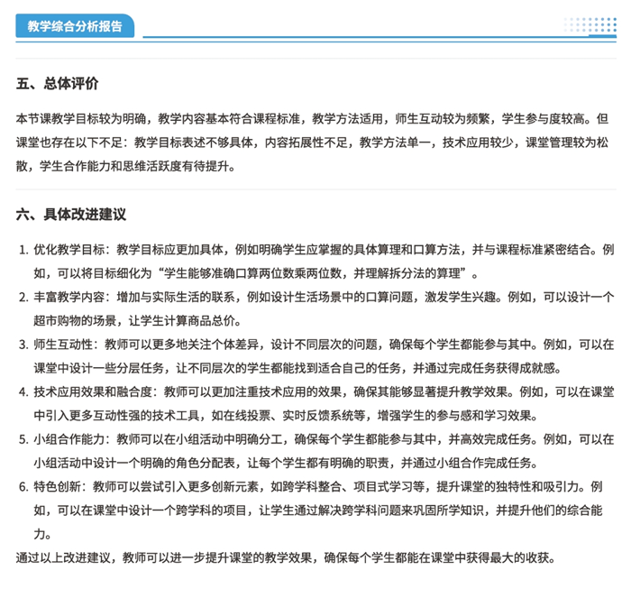 課后2分鐘內,系統快速生成純文本式的課堂分析報告,幫助教師直觀地理解報告內容。首先,報告對本堂課的新課標要求和教師的新課標達成情況進行歸納總結。其次,采用涑水聯合雙語學校的評價量表,從六大個方面(教學目標、教學內容、教學方法、技術使用、學生表現、教學特色)、24個細分觀察維度進行量化評分,并對每一個得分點進行詳細說明。最后,結合課堂教學實例,對標學校的評價要求,從師生互動性、技術應用效果和融合度、小組合作能力三大方面提出了15條建議,讓教師能夠在深度反思中有針對性地改進自身教學實踐。