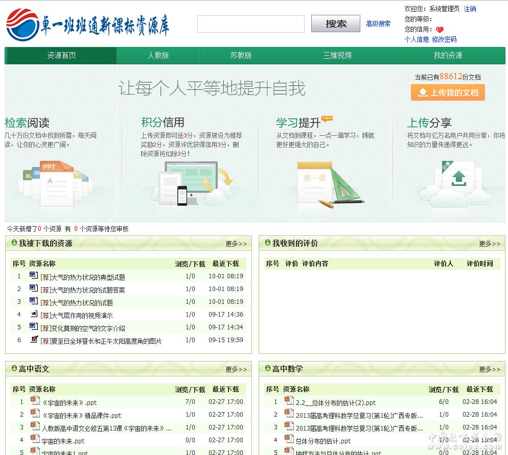 -------------------------------------------------------------------------------- 產品特點 • 嚴格遵循《基礎教育教學資源元數據規范》國家標準。 • 內容豐富:人教版、北師版、蘇教版、三維視頻、東師版、譯林版、外研社、科教版、粵教版、湘教版等版本。 • 表現形式多樣,用戶上傳的文檔自動轉換成在線預覽模式,方便閱讀,下載依然是可編輯的文檔。 • 引入EMIF規范實現與城域網的資源交換,達到了資源共建共享。 • 可實現跨區域、跨庫的資源檢索。 • 提供個性化的資源預訂。 • 嚴格的資源審核和授權機制體現的系統的安全性。 • 分布式存儲和管理增強了系統的穩定性。 • 多緯度的資源呈現,友好的用戶界面體現了系統的易用性。