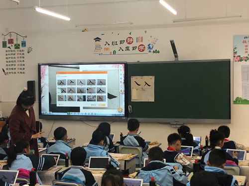 上午9點,家長們陸續來到學校走進課堂。此次開放日,學校特意安排了多門不同課程供家長觀摩。除了語文、數學、英語等基礎學科之外,還有書法、音樂等藝術學科以及親子互動課。老師們各展身手,學生們興趣盎然。書法課上,老師細致地講解“入”字筆畫書寫,同時讓學生各自進行練習并使用希沃學生平板對自己的書法作品進行拍照上傳,所有同學和老師都能夠及時看到彼此的學習結果。通過對比,老師再進一步講解,糾正落筆細節錯誤。在場的家長驚喜地表示,沒想到書法課還能和信息技術融合得這么好,不僅可以及時把孩子的學習情況直觀呈現出來,還能夠借此及時反饋孩子的學習情況�!叭绻郧白约荷蠈W的時候就有希沃易課堂就好了。”