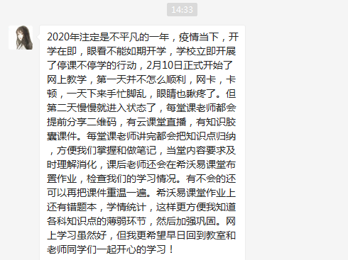 在這場戰役中,漢江大地上這所身處疫情重災區的——湖北省襄陽宜城市城關初級中學的老師們敢于走在教育最前線,響應“停課不停學、延期不延學”的號召,充分利用希沃易課堂+云課堂線上全流程教學方案覆蓋線上教學每一環,涵蓋課前備課、課中教學、課后總結等,最大限度保障了“停課期間”學生們的學習進度。