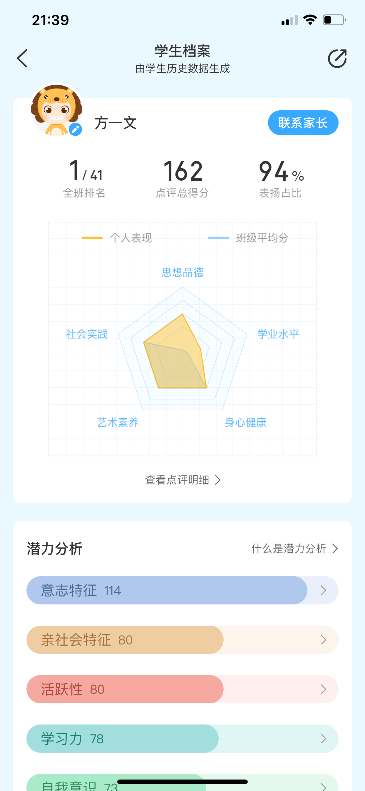 班優中豐富的點評功能讓老師實時記錄孩子們的每一個閃光點,每周更新的光榮榜更能激發孩子們的學習熱情。基于過程性評價,班優還提供了階段性的智能評語,老師只需一步操作就能為每一個孩子生成個性化的成長建議。