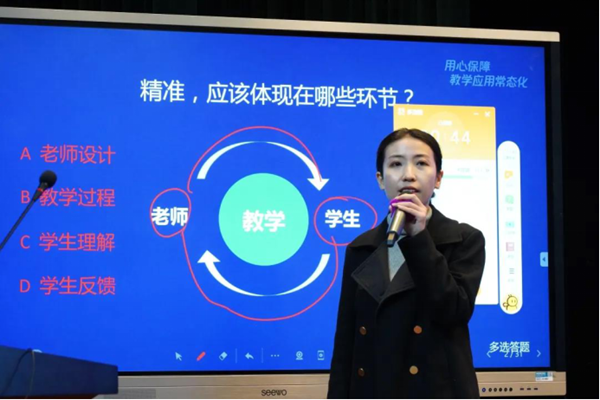 隨后,希沃學(xué)務(wù)事業(yè)部服務(wù)運(yùn)營總監(jiān)馮智慧,針對(duì)精準(zhǔn)教學(xué)這一主題,為各位學(xué)員展開培訓(xùn)。在互動(dòng)生成的設(shè)計(jì)中,學(xué)員們通過學(xué)生平板實(shí)現(xiàn)實(shí)時(shí)反饋,充分感受到了智慧課堂帶來的別樣魅力。