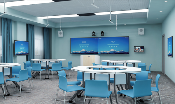 在青島大學(xué)的小組研討教室,利用希沃品課系統(tǒng)配合交互智能顯示設(shè)備,實(shí)現(xiàn)教師端、小組端及學(xué)生端三端互聯(lián),組成互動(dòng)教學(xué)系統(tǒng);搭配四機(jī)位交互智能錄播滿足日常金課課程庫建設(shè),輔以物聯(lián)中控講臺(tái)、校園宣傳、及教室擴(kuò)音系統(tǒng),實(shí)現(xiàn)高校教室環(huán)境下教學(xué)全過程的智能交互,互動(dòng)應(yīng)用。