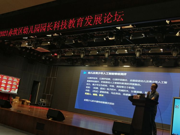 中國國際科技促進會青少年人工智能教育普及工作委員會順應(yīng)時代需求,制訂了全國中小學(xué)幼兒園人工智能教育技術(shù)規(guī)范,并在全國開展普及推廣工作。來自智工委湛江中心吳華主任,在會上與園長們分享全國幼兒積木建構(gòu)教育普及開展的經(jīng)驗和方法。從課程體系建設(shè)、積木教育師資培養(yǎng)、教學(xué)成果評估和全國賽事活動幾個方面,進行了全面、深入的交流和探討,幫助幼兒園解決課程、師資、教研教學(xué)活動開展、教學(xué)成果評估等教學(xué)實踐問題。