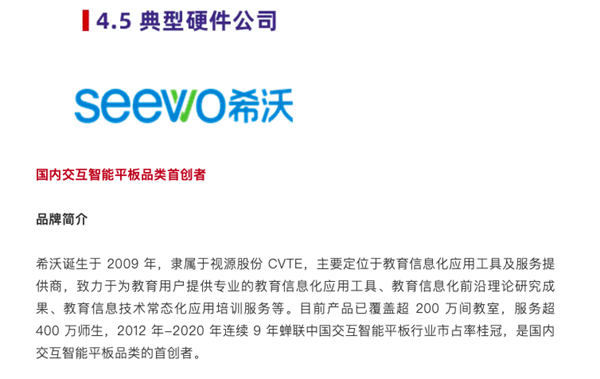 報告分析,希沃強大的硬件研發和生產能力,并緊抓教育信息化對硬件產品的剛需,是其作為硬件廠商典型代表的優勢。