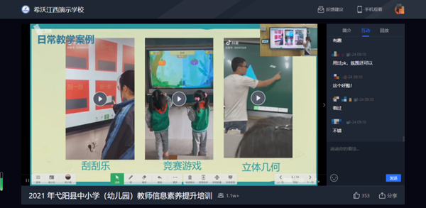 為了進一步提升教師現代教育技術應用能力,激發教師的創新意識,探討交互式多媒體環境下教與學的模式與方法,8月24-9月7日弋陽縣教體局攜手希沃團隊展開了15天的線上交流培訓活動。此次活動覆蓋了全縣65所學校,共計3297名教師踴躍參加。