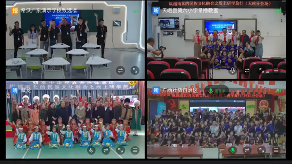 據介紹,活動現場,內蒙古阿龍山小學的蒙古族和鄂溫克族、廣西環江縣的毛南族、天峨縣的壯族一起在線上共同參與,他們盡情表演精彩紛呈的民族文化歌舞,展示民族文化多元魅力。
