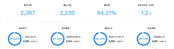 本次線上培訓自8月23日開展以來,包含7天的線上研修學習,8天的交互式課件大作業,參訓學校涵蓋37所,參訓老師達2367人,其中2230位老師通過該培訓,綜合結業率達到94.21%。此次線上培訓讓教師們了解并掌握課件制作的能力,利用信息化工具制作生成互動式課件進行互動性教學。且達到了培訓過程可視化、結果可量化的預定目標。