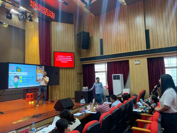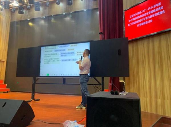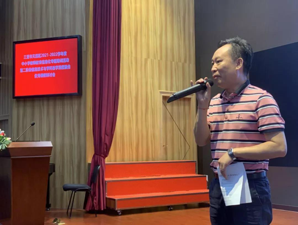 天涯區教育局教研室主任楊得伸上臺發表講話:“當前,教育信息化已經步入加快推進的黃金時期,也進入升級發展的關鍵期。我區堅持‘以信息技術與教育教學深度融合推動教育理念變革、模式再造、體系重構、機制創新’核心理念,聚焦‘智慧教育示范區’建設目標,聚力實施‘天涯區智慧教育建設行動’。在剛結束的線上學習中,我區共計886人通過培訓,整體培訓通過率達到87%,其中16人被評為優秀學員;在此我對以上老師表示衷心的祝賀。今天我們邀請到海口北師大、華二黃流中學、北京外國語附屬的三名教師給我做公開課分享交流活動。希望老師們有所成長、有所收獲。最后,要再次感謝希沃在本次活動中的大力支持。”