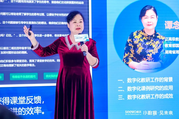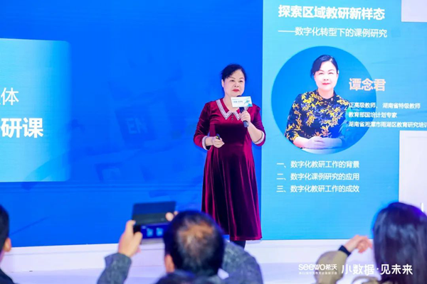 展會上,一場交流會吸引了現場眾多觀眾的駐足圍觀,教育部國培計劃專家、湖南省湘潭市雨湖區教育研究培訓中心數學教研員譚念君,以“探索區域教研新樣態——數字化轉型下的課例研究”為題,向觀眾分享了數字化教研經驗,共同研討數字化教育的新發展。