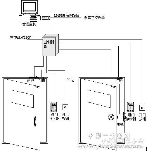 2)、一體機門禁:主要由一體門禁控制器、控制開關、電鎖(或磁力鎖)、電源和卡等部分組成,工作模式為:卡或密碼、卡加密碼、單獨卡開門。