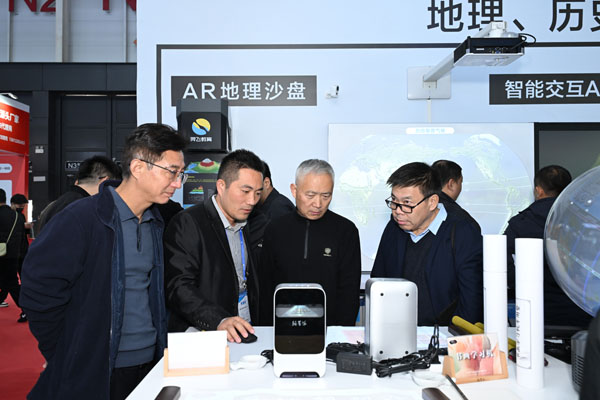 在歷史與地理學(xué)科展區(qū),智慧雙屏互動歷史沿革系統(tǒng)與智能交互 AR 立體地形演示系統(tǒng)帶來沉浸式教學(xué)新體驗。前者采用雙屏聯(lián)動設(shè)計,左側(cè)呈現(xiàn)歷史文獻(xiàn)、圖片等靜態(tài)資源,右側(cè)動態(tài)演繹事件發(fā)展脈絡(luò),教師可通過拖拽、標(biāo)注實(shí)現(xiàn)古今對比教學(xué);后者借助 AR 技術(shù)構(gòu)建三維地形模型,學(xué)生輕觸手勢即可查看山脈、河流等地形特征,直觀理解等高線等抽象概念,徹底打破平面教學(xué)局限。現(xiàn)場參展的中學(xué)地理教研員表示:“以前講地形演變要靠掛圖和想象,現(xiàn)在 AR 模型讓知識點(diǎn)‘活’了起來,學(xué)生理解效率至少提升一倍。”