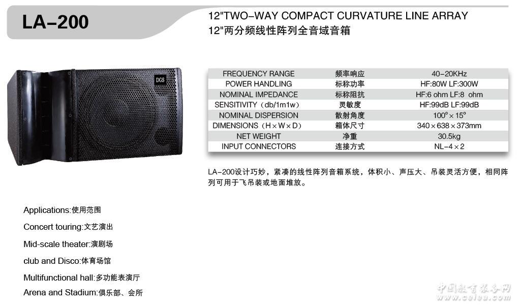LA-200設計巧妙,緊湊的線性陣列音箱系統,體積小,聲壓大,吊裝靈活方便,相同陣列可用于飛吊裝或地面堆放。