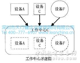 ③ 在虛擬成組生產(chǎn)單元中,引入工作中心的概念,如下圖所示。適當?shù)卦谔摂M成組生產(chǎn)單元中整合或分解生產(chǎn)工序并匹配相應設備,組織出類似下圖中的工作中心。對于工序間生產(chǎn)時間差別較大的問題,工作中心會起到較好的解決效果;