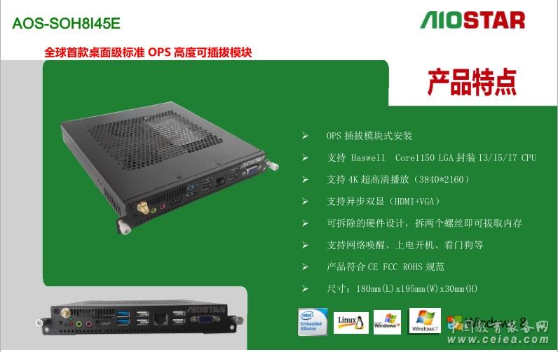 Aiostar OPS 全稱為:Aiostar Open Pluggable Specification,開放式可插拔規(guī)范。是Intel與顯示器廠商共同制定的標(biāo)準(zhǔn)化數(shù)字標(biāo)牌接口規(guī)范。OPS內(nèi)部組成是一個X86架構(gòu)的迷你PC,采用英特爾酷睿處理器,配有內(nèi)存、硬盤、多種輸入輸出接口以及Windows操作界面,尺寸為200mm x 119mm x 30mm 。 以下為Intel 官網(wǎng)對于OPS的定義: 原文如下: Digital Signage Open Pluggable Specification :Simplify digital signage development Highlights Enables easier installation, use and maintenance of digital signs. Makes digital signage devices more intelligent and connected. Overview The open pluggable specification (OPS) helps standardize the design and development of digital signage devices and pluggable media players. Intel created OPS to address digital signage market fragmentation and simplify device installation, usage, maintenance and upgrades. OPS enables digital signage manufacturers to deploy interchangeable systems faster and in higher volumes, while lowering costs for development and implementation. Installing digital signage equipment based on Intel architecture helps you implement scalable digital signage applications that can network easily with other equipment. This simplifies interoperability and application upgrades designed to meet the digital signage requirements of individual customers, while helping to future-proof technology investments.[1] 譯文: 強調(diào) 更便于安裝、使用和維護的數(shù)字信號。 使數(shù)字看板設(shè)備更智能和融合。 概述 開放的可插拔的規(guī)范(OPS)有助于規(guī)范的設(shè)計和開發(fā)數(shù)字看板設(shè)備,并插入媒體播放器終端。Intel創(chuàng)造OPS 致力于數(shù)字看板市場分化和簡化設(shè)備安裝、使用、維護和升級。 OPS可以使數(shù)字看板制造商更快部署大量的交互系統(tǒng),同時降低開發(fā)和實現(xiàn)的成本。 安裝基于英特爾架構(gòu)的數(shù)字標(biāo)牌設(shè)備可以幫助您實現(xiàn)可伸縮的數(shù)字看板應(yīng)用程序,并且很容易和其他設(shè)備進(jìn)行網(wǎng)絡(luò)連接。這簡化了通過交互和升級的設(shè)計來滿足個人客戶的數(shù)字看板需求,同時有利于面向未來的技術(shù)投資。 2特點編輯 1、支持?jǐn)?shù)字標(biāo)牌等行業(yè)最新的OPS規(guī)范的電腦模塊,加速數(shù)字標(biāo)牌行業(yè)的標(biāo)準(zhǔn)化趨勢。 2、OPS模塊可以簡化設(shè)備的安裝、使用、維護和更新,幫助數(shù)字標(biāo)牌制造商降低開發(fā)和實施成本。 3、OPS可簡便地與其它設(shè)備聯(lián)網(wǎng),可擴展數(shù)字標(biāo)牌應(yīng)用,滿足數(shù)字標(biāo)牌對交互和應(yīng)用更新的需求。 4、部分OPS平臺支持遠(yuǎn)程管理及低功耗模式,解決耗電及散熱要求。同時平臺所支持的Intel vPro、AMT遠(yuǎn)程管理技術(shù),實現(xiàn)設(shè)備無人操控下的高效運作。如采用四代i5+Q87平臺的AOS-SOQ8I45A 5、OPS無風(fēng)扇散熱設(shè)計,提供超靜音的解決方案,保證工作環(huán)境的安靜、清爽。發(fā)熱量小也帶來了較小的功耗。 3整機編輯 Intel 2011年提出該規(guī)范后,伴隨著日本NEC OPS接口顯示器的上市,傳統(tǒng)數(shù)字標(biāo)牌嵌入式主板走下神壇,OPS模塊化正式開啟。代表作品有 愛鑫微電子(AIOSTAR) AOS-SOH8I45A ,