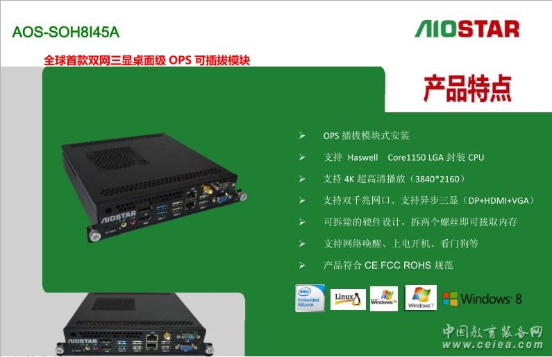 1概述編輯 Aiostar OPS 全稱為:Aiostar Open Pluggable Specification,開放式可插拔規范。是Intel與顯示器廠商共同制定的標準化數字標牌接口規范。OPS內部組成是一個X86架構的迷你PC,采用英特爾酷睿處理器,配有內存、硬盤、多種輸入輸出接口以及Windows操作界面,尺寸為200mm x 119mm x 30mm 。 以下為Intel 官網對于OPS的定義: 原文如下: Digital Signage Open Pluggable Specification :Simplify digital signage development Highlights Enables easier installation, use and maintenance of digital signs. Makes digital signage devices more intelligent and connected. Overview The open pluggable specification (OPS) helps standardize the design and development of digital signage devices and pluggable media players. Intel created OPS to address digital signage market fragmentation and simplify device installation, usage, maintenance and upgrades. OPS enables digital signage manufacturers to deploy interchangeable systems faster and in higher volumes, while lowering costs for development and implementation. Installing digital signage equipment based on Intel architecture helps you implement scalable digital signage applications that can network easily with other equipment. This simplifies interoperability and application upgrades designed to meet the digital signage requirements of individual customers, while helping to future-proof technology investments.[1] 譯文: 強調 更便于安裝、使用和維護的數字信號。 使數字看板設備更智能和融合。 概述 開放的可插拔的規范(OPS)有助于規范的設計和開發數字看板設備,并插入媒體播放器終端。Intel創造OPS 致力于數字看板市場分化和簡化設備安裝、使用、維護和升級。 OPS可以使數字看板制造商更快部署大量的交互系統,同時降低開發和實現的成本。 安裝基于英特爾架構的數字標牌設備可以幫助您實現可伸縮的數字看板應用程序,并且很容易和其他設備進行網絡連接。這簡化了通過交互和升級的設計來滿足個人客戶的數字看板需求,同時有利于面向未來的技術投資。 2特點編輯 1、支持數字標牌等行業最新的OPS規范的電腦模塊,加速數字標牌行業的標準化趨勢。 2、OPS模塊可以簡化設備的安裝、使用、維護和更新,幫助數字標牌制造商降低開發和實施成本。 3、OPS可簡便地與其它設備聯網,可擴展數字標牌應用,滿足數字標牌對交互和應用更新的需求。 4、部分OPS平臺支持遠程管理及低功耗模式,解決耗電及散熱要求。同時平臺所支持的Intel vPro、AMT遠程管理技術,實現設備無人操控下的高效運作。如采用四代i5+Q87平臺的AOS-SOQ8I45A 5、OPS無風扇散熱設計,提供超靜音的解決方案,保證工作環境的安靜、清爽。發熱量小也帶來了較小的功耗。 3整機編輯 Intel 2011年提出該規范后,伴隨著日本NEC OPS接口顯示器的上市,傳統數字標牌嵌入式主板走下神壇,OPS模塊化正式開啟。代表作品有 愛鑫微電子(AIOSTAR) AOS-SOH8I45A ,