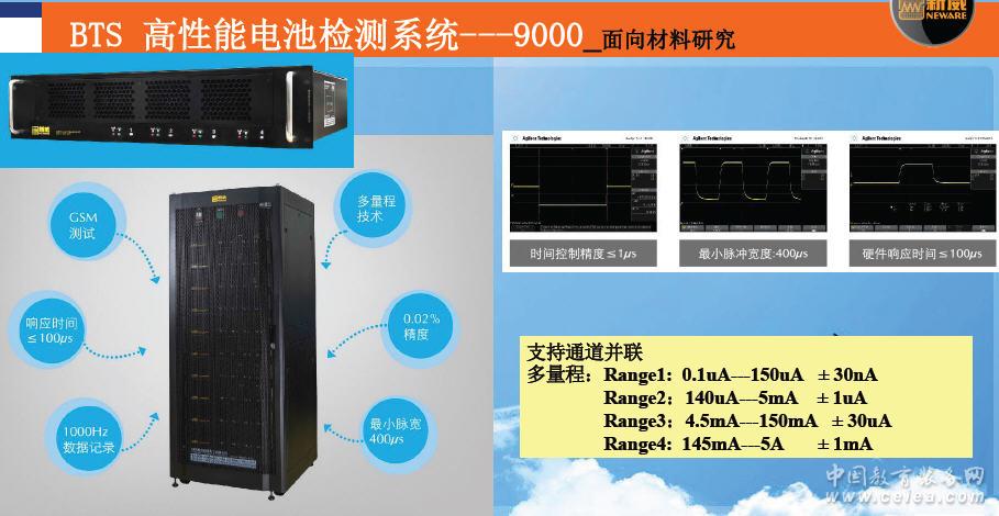 產品詳細介紹產品簡介: ① BTS-9000基于NEWARE第6代測試系統架構,主要用于電池材料研究、高精度測試、脈沖充放電測試、DCIR(直流內阻)測試、Cycle Life測試。 ②BTS-9000目標客戶群體為:各研究機構、高校和電池生產企業實驗中心。 應用領域 項目 應用領域 ①高精度測試: 電壓、電流、容量、能量 ②電池性能測試: 循環壽命、過充、過放 ③脈沖測試: 直流內阻(DCIR測試、HPPC測試、支持GSM脈沖放電測試及循環壽命測試 ④分選: 電池一致性測試與評估 ⑤材料研究: 最小測試量程到μA級 技術指標 項目 技術指標 ①輸出范圍(可定制): 電壓:0~5V ②分辨率: 16bit ③控制精度: ±0.02% of FS ④測量精度: ±0.02% of FS ⑤硬件響應時間: 電流(10%~90%)響應時間≦100μs ⑥數據記錄: 最高達1000Hz , 支持△t/△U/△/I作為記錄條件 ⑦支持模式: 充電:CCC,CVC, CC&CVC, CPC, Pulse; 放電:CCD, CVD, CRD, CPD, Pulse ⑧并聯模式: 支持通道聯 ⑨多量程: Range 1 160μA滿量程 ±32 nA Range 2 50mA滿量程 ±1μA Range 3 160mA滿量程 ±32μA Range 4 5000mA滿量程 ±1mA 威高精度電池檢測柜分為四大系列: