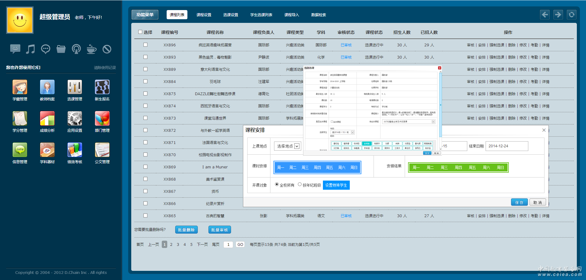 選課設置 課程類型樹形方式的自定義設置、年度學期的上課時間和上課地點的設置。 課程設置 每個年度學期對選課開關、選課開放年級、學生每學期最多選課門數、選課最大學分限制、學生退課限制等進行自定義設置。 選課申報 課程名稱設置、任課教師設置、教學班名稱、選課的開始與結束時間、最大招生人數、最小開班人數、每班最多招生人數、課時數、學分、考核方式、課程類型等自定義設置,并且支持批量導入。 課程安排 課程申報完成后,需要相關負責人審核,審核通過后,設置課程上課地點安排、上課時間進行安排、以及該課程的開放對象以及特殊學生剔除條件。 學生選課 學生在開放的待選課程中進行在線選課,選課完成后,教師對學生選課進行審核,也可開啟自動審核的模式。 課程考勤 根據教師上課時間自動生成考勤的表單,任課教師在線打考勤。 學生學分 任課教師根據學生學習情況和考勤,為學生打學分,未通過學生生成補考通知。 統計分析 課程選課情況統計、未選課學生統計、已選課學生統計、未考試通過學生統計、上課考勤統計。 |