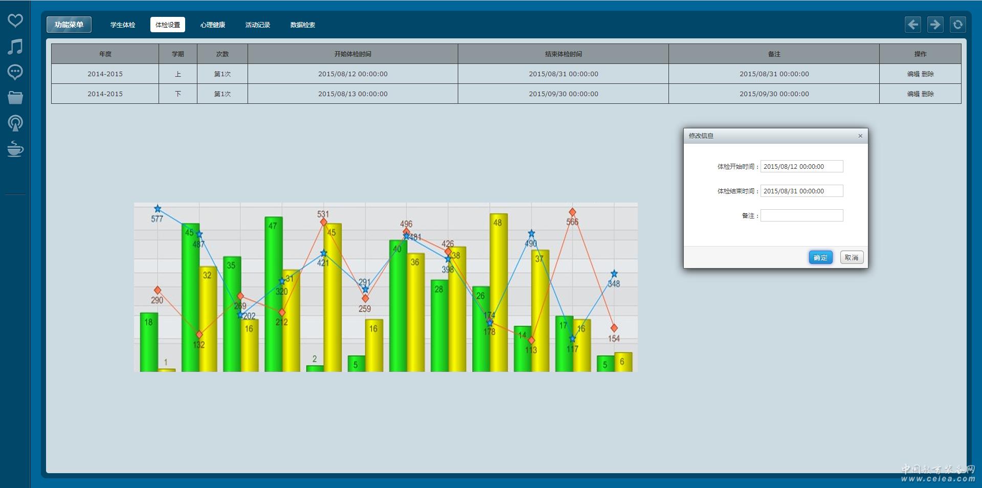 健康教育計劃 包含對教育計劃項目的設置,同時包含了針對計劃項目階段性的設置(計劃資料信息及文件的添加上傳),同時還包含教育計劃的分類管理。 健康教育安排 對設置的教育計劃進行人員培訓范圍和時間的安排通知。 課時計劃 對安全教育計劃設置相應的課時安排,課時是時間段控制檢測登陸學習人員信息。 健康教育考核 包含導入考核試卷,人員在線作答,在線評分,成績公布,不及格補考學習。 常見病防治 定期錄入常見病及相應的防止措施,采用共享的模式,統計瀏覽、下載次數。 學生體檢 包含體檢項目的設置(年度學期、體檢開始時間、體檢結束時間、備注),學生體檢信息錄入,采用自動關聯學生的方式針對學生牙齒、血壓等進行學生的體檢登記。 心理健康 構建學生心理健康檔案,制定心理健康檢查內容模板,通過智能對比分析,實時監測學生心理健康現狀,極大的方便學校對學生心理數據的收集,整理與規范。 綜合分析 包含對學生的健康進行的分析、健康教育方案實施的統計分析等。 |