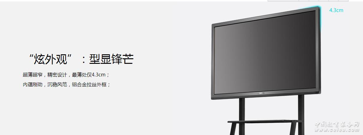 產品詳細介紹產品特性 1、超薄超窄外觀,前置按鍵,前置USB端口,模塊化安全設計 2、第六代觸控技術: (1)抗光干擾(陽光直射照常使用) (2)防遮蔽功能(八點遮蔽,照常使用) (3)觸摸算法優化程度高,響應速度快,書寫和演示流暢度高 3、通過EMC測試(輻射遠低于歐盟標準,確保產品綠色健康) 4、顯示、觸控、智能核心、PC一體融合 (1)高清高清圖像處理引擎 (2)智能電視芯片,智能Android操作系統 (3)觸摸切換菜單(在任意通道狀態下都可以使用觸控操控智能平板) (4)不需要PC可實現書寫批注,課件播放,視頻播放功能 5、雙系統設計 (1)插拔式PC設計(降低運行噪音,易于維修) (2)內置智能核心和操作系統,與PC系統互為備用 6、一鍵黑屏(節能、環保,提升使用壽命) 7、環境適應(通過0°- 40°環境模擬嚴格測試) 8、屏幕防劃防撞擊(4mm厚莫氏七級鋼化保護屏)