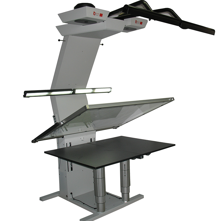 紫外線/紅外線和無臭氧照明系統(tǒng)。光照低于 2,500 lux,滿足保護(hù)生態(tài)要求。照明裝置開發(fā)的菲涅爾透鏡是比其他制造商的照明設(shè)備具有顯著的技術(shù)優(yōu)勢。它們確保完美的光分布和照明。避免了不需要的和破壞性的漸變和反射效果,否則會在非常亮或非常暗的區(qū)域以及閃亮的材料中出現(xiàn)。 PLC 控制的電動升降柱可將書臺的調(diào)節(jié)至 25 厘米,如果需要,可精確調(diào)節(jié)至 40 厘米。它們每個高達(dá) 180 公斤的負(fù)載能力而設(shè)計,可輕松支持非常厚重的掃描。由于集成了微傳感器,它們可以使用手和腳控制進(jìn)行操作。因此,Hornet 不僅為大幅面文檔和沉重的書籍提供了極其溫和的記錄概念,而且還具有無與倫比的用戶友好性,滿足現(xiàn)代、符合人體工程學(xué)的工作場所的要求。