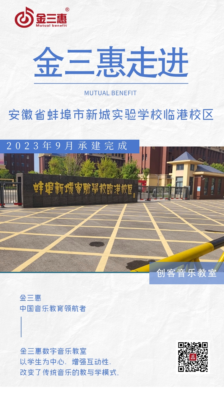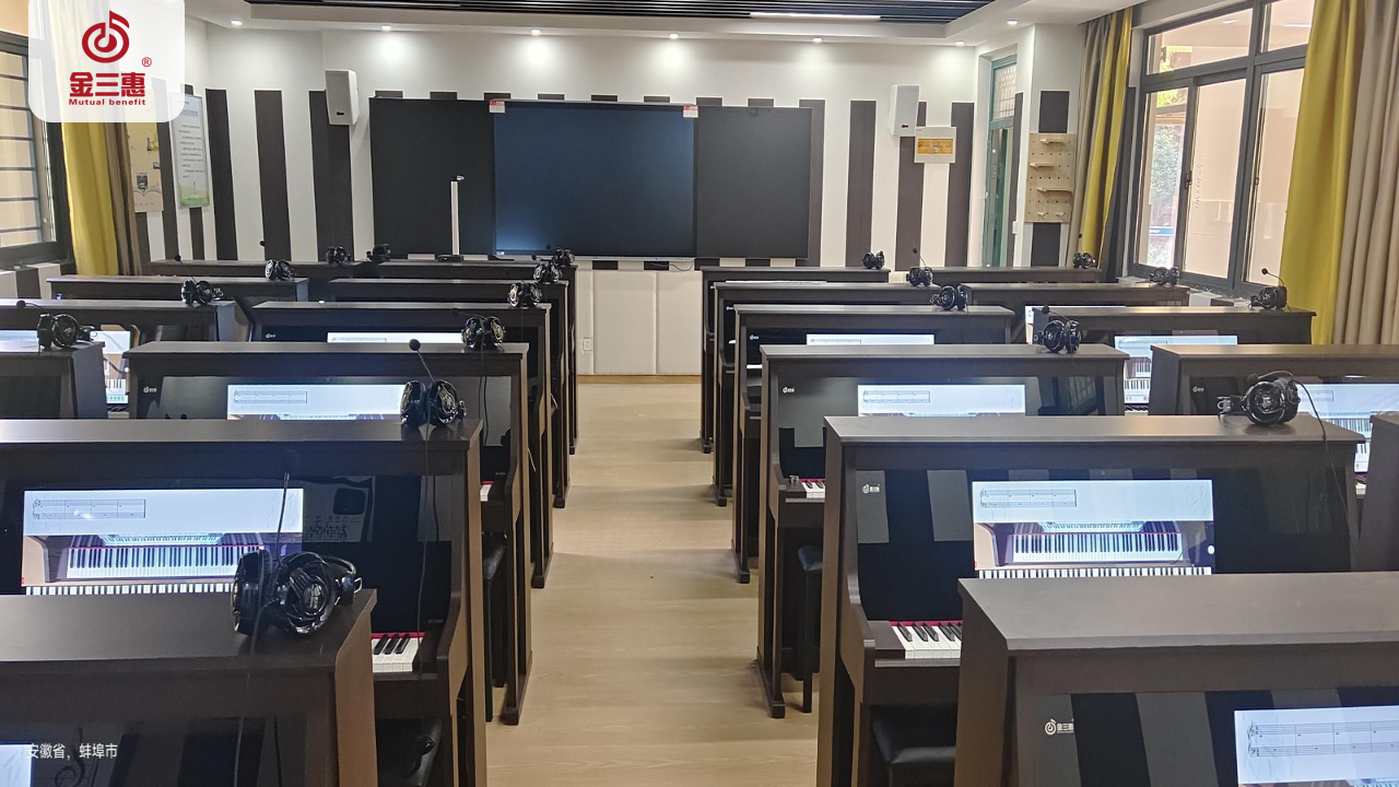 2023年9月,金三惠數(shù)字音樂教室為安徽省蚌埠市新城實驗學校臨港校區(qū)提供、安裝、培訓的24+1智慧創(chuàng)客音樂教室正式開始使用!配備了金三惠教學系統(tǒng)、電鋼琴、數(shù)字音樂教學儀等教學教具。