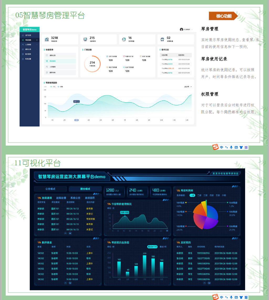 產品詳細介紹   要求響應建設智能化校園,統籌建設?體化智能化教學、管理與服務平臺。以智慧理念打造出的學校琴房管理,能夠充分、合理的整合利用資源,提升琴房管理的效率。