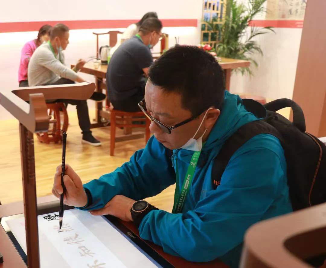 華文眾合展位參觀者認真聽取第七代智慧書法教室講解并參與互動