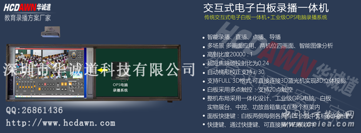 產品詳細介紹智能錄播、直播、點播、導播 多場景 多畫面應用、兩機位四畫面、智能圖像分析 高對比度20000 : 1 超短焦鏡頭投射比為0.24 自動梯形校正支持± 30 支持FULL 3D格式,可直接連接3D藍光機實現3D立體投影 白板采用多點觸控:支持20點觸控 整機布局采用一體化設計、工業級ops電腦、白板 實物展臺、中控、功放音箱集成在整個框架內 面板快捷鍵:白板兩側每側各具有22個帶中文標識的物理 快捷鍵、通過快捷鍵、可直接操作白板軟件 |