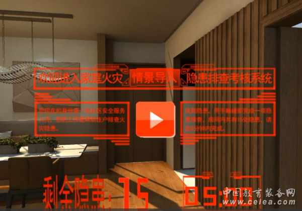 三﹑場景設定 場景:普通家庭環境 身份設定:社區安全服務人員 任務設定:幫助小區住戶排查家中的消防安全隱患點 任務要求:房間內共有15處隱患,需要在5分鐘內完成
