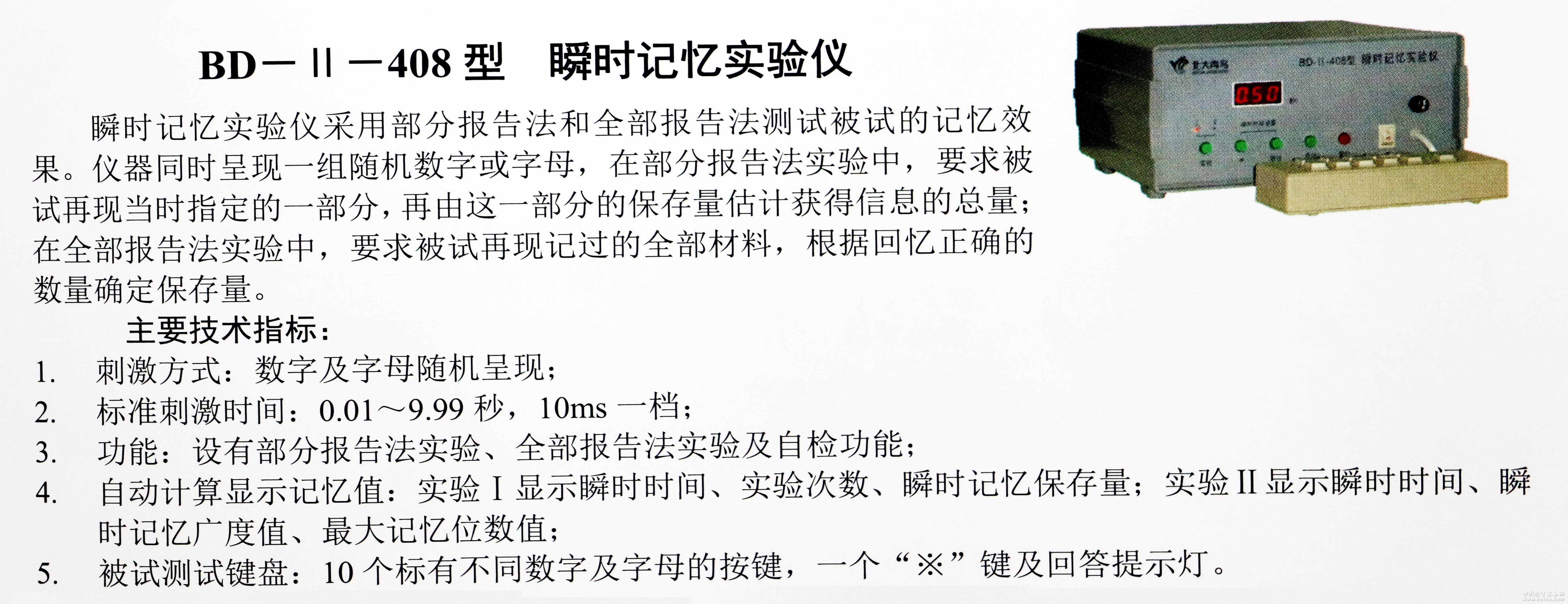 產(chǎn)品詳細(xì)介紹采用部分報(bào)告法和全部報(bào)告法測試被試的短時(shí)記憶效果。刺激方式:數(shù)字及字母隨機(jī)呈現(xiàn);標(biāo)準(zhǔn)刺激時(shí)間:0.01—9.99秒,10ms一檔;功能:設(shè)有部分報(bào)告法實(shí)驗(yàn)、全部報(bào)告法實(shí)驗(yàn)及自檢功能;自動(dòng)計(jì)算顯示記憶值。 |
