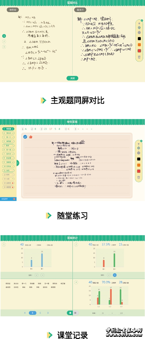 光大教育紙筆課堂以課堂互動需求為出發(fā)點,通過教師平板、學生智能手寫板(百分板)的快速接入,協(xié)助教師開展課堂即時互動,并自動采集課堂數(shù)據(jù),讓教師能關注到每一個學生。