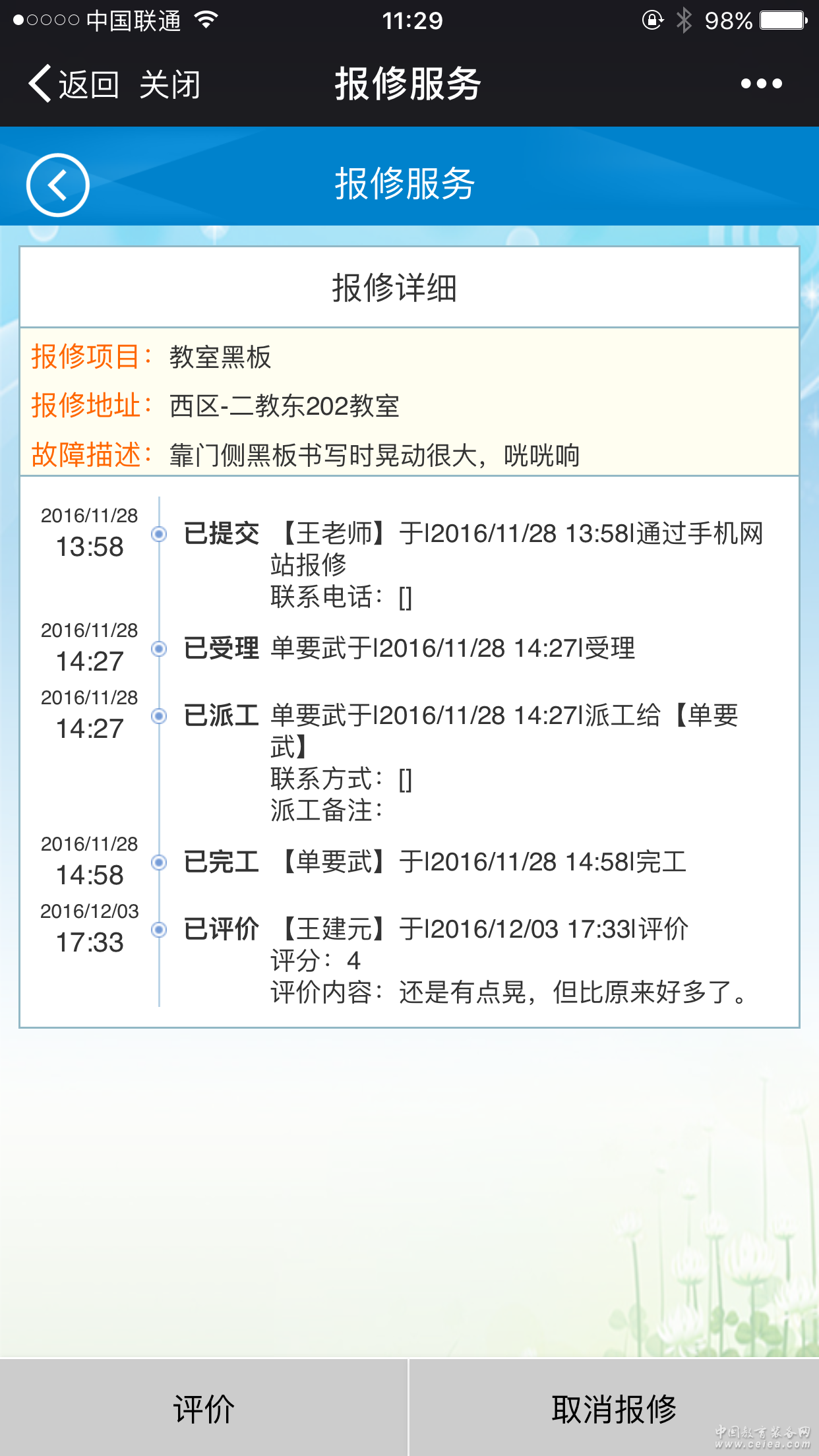 平臺特點: (1) 報修用戶: u 可以通過微信一鍵提交保修單; u 可以實時采集照片,方便管理人員派工; u 可以隨時查看報修進度和狀態; u 可以評價維修工人 (2) 管理人員: u 可以隨時查看報修情況; u 可以將報修任務指派給維修工人; u 可以實時掌握維修情況 (3) 學校領導: u 可以實時跟蹤、記錄和監管; u 可以掌握學校資產的使用情況; u 為領導提供決策支持 |