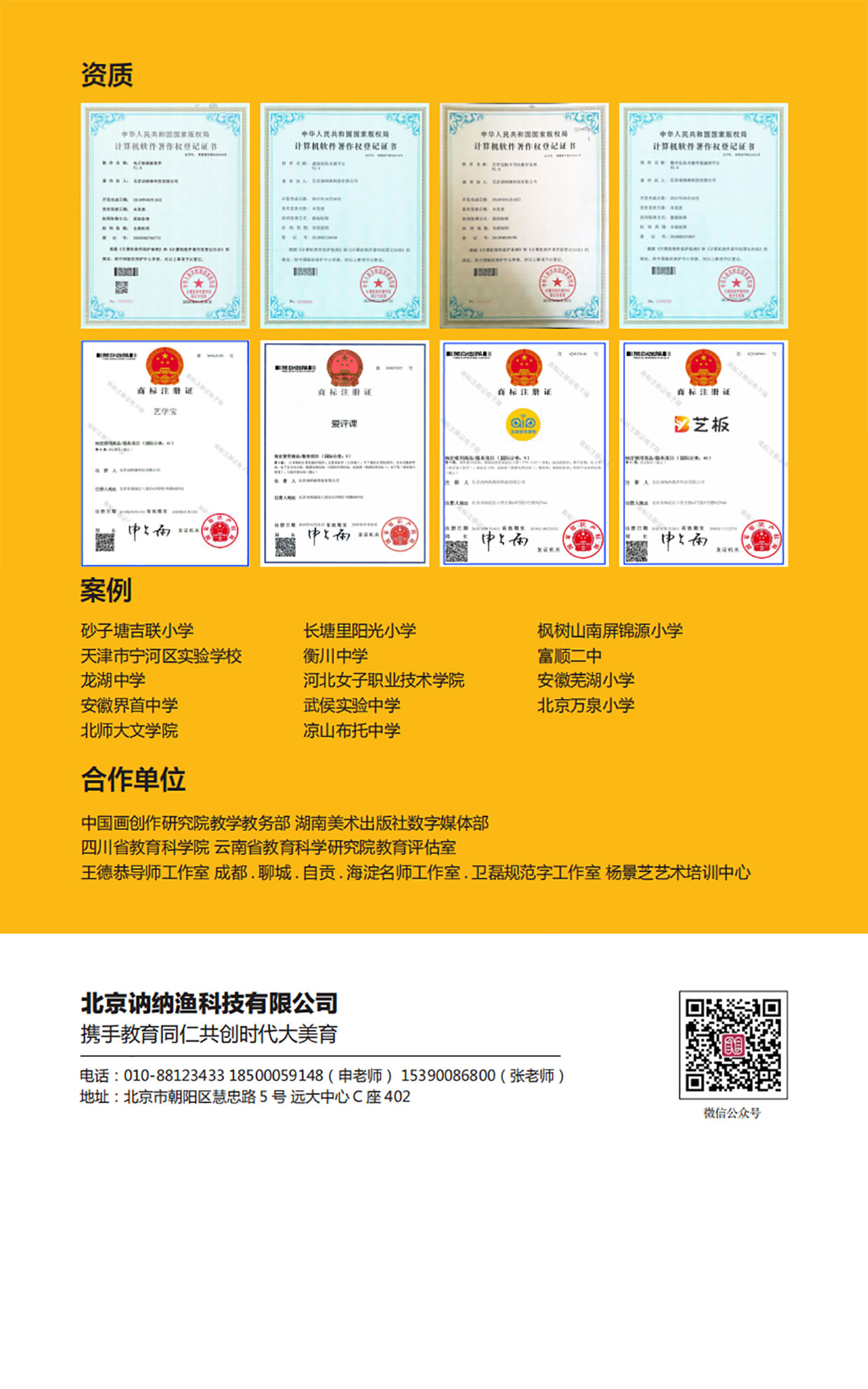 擁有自主開發的系列產品,涉及中國傳統文化書畫教室、老師成長和提升的教研產品、增賦減負備授課工具、提升優質資源均衡的結對課堂。自主研發產品:課堂評價-愛評課、美術教絡系統-藝學寶、數字臨摹書法教室-藝學寶、互動結對課堂、名師專遞課堂。配套硬件產品:藝板繪畫屏、藝學寶書法臨摹全貼合屏,產品優勢:數據采集與運用、互聯網+等創新運用在教學和教研,助力英音美薄弱學科的師資水平提升和名師課堂發揮普惠作用。