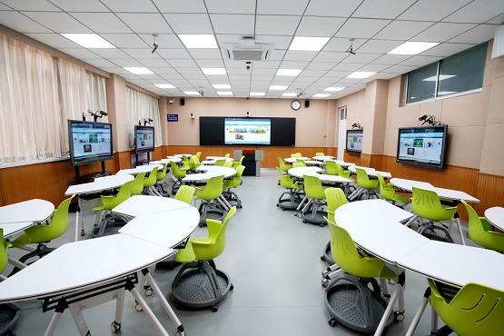 智慧教室分組布局靈活多變,師生們可以根據(jù)課堂教學(xué)環(huán)節(jié)的需要進行自由組合。在分組教學(xué)過程中,學(xué)生可以通過手機等智能設(shè)備,連接到課堂中參與小組討論,學(xué)生手中的“小屏”、每個小組設(shè)置的“中屏”以及教室前方的大屏之間可以進行輕松投屏互動。