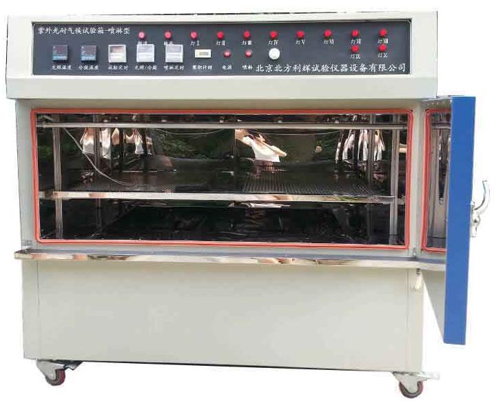 室內特設一套空調裝置,安排空氣加熱和水加熱兩種加熱器,滿足試驗室內所需的溫度和濕度,室內的溫濕度保持均勻。在燈管臺架燈管間隙合理地設計了數個噴嘴對樣品進行模擬淋雨試驗,模擬夏天溫度最高時,光照zui強力的時候突然下一陣暴雨的環境再現,樣品表面溫度驟降,同時使樣品背面產生凝露,對樣品進行最嚴酷的環境考驗。
