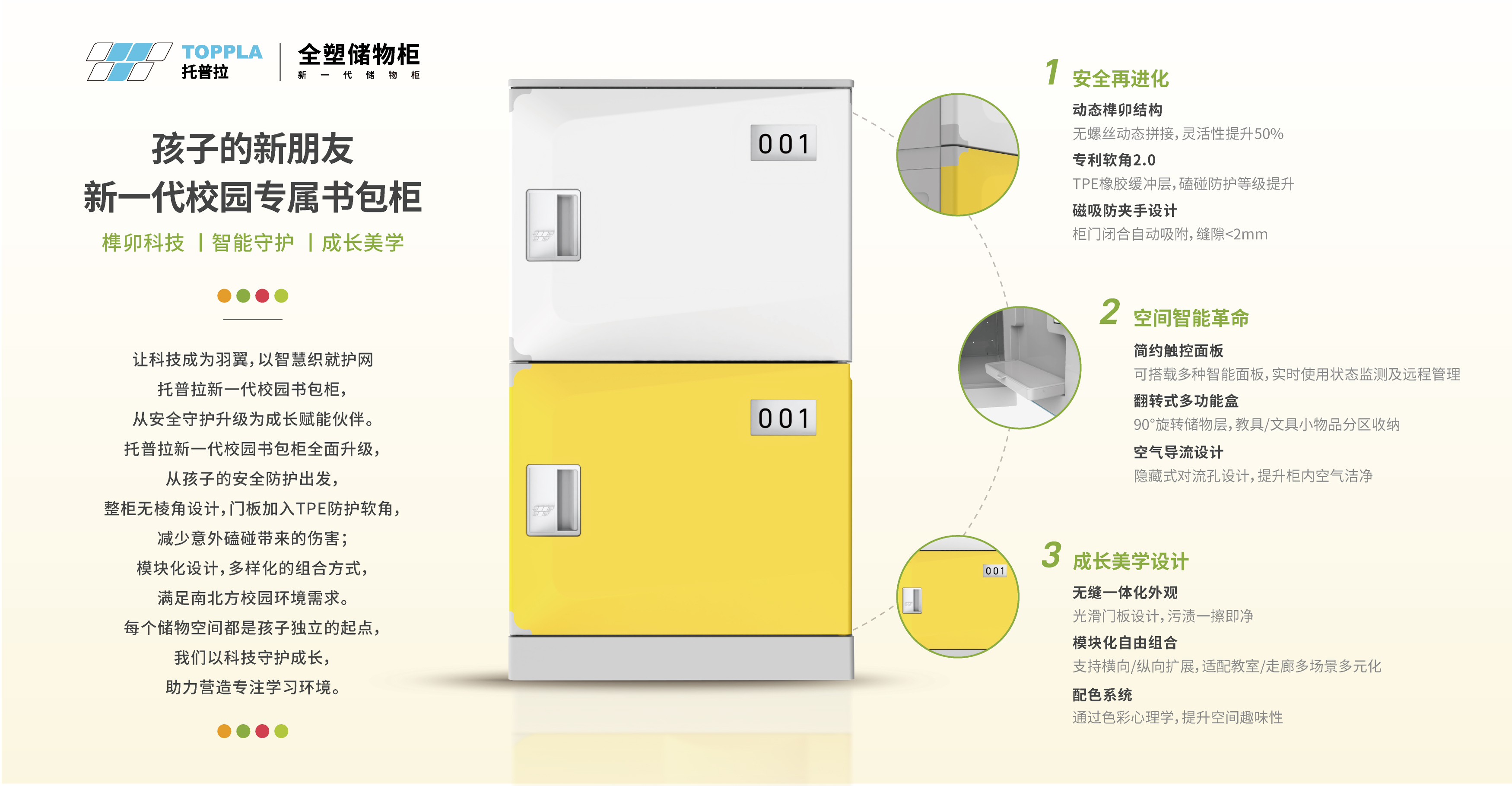 舊校區(qū)空間規(guī)劃固化、新校區(qū)新需求多元,是對儲(chǔ)物柜靈活性的一大挑戰(zhàn)。托普拉全塑儲(chǔ)物柜采用模塊化設(shè)計(jì)與榫卯結(jié)構(gòu),整柜無螺絲,安裝便捷,更能根據(jù)教室、走廊、宿舍等不同空間進(jìn)行自由組合與擴(kuò)展。舊校區(qū)固有空間下,不改變空間格局,契合可用空間提供儲(chǔ)物柜解決方案;新校區(qū)配合使用需求進(jìn)行精準(zhǔn)測量、個(gè)性化布局,將有限空間使用率最大化。