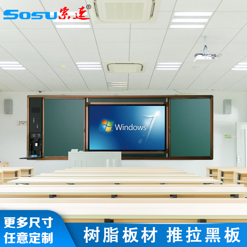 產品詳細介紹結構:內外雙層分離式結構,內層為兩塊固定書寫板與一體機正面平齊,外層為兩塊滑動書寫板,滑動板配裝掛鎖,省時省力,使傳統教學板與現代科技完美結合,關閉時可確保一體機的安全管理。 外徑尺寸:外徑:4000mm×1300mm可根據所配電子產品適當調整,確保電子產品的有效配套。 書寫板面:采用優質烤漆板面,墨綠色、亞光,厚度≥0.35mm,粗糙度為Ra1.6-3.2 um,光澤度≤6光澤單位,沒有因黑板本身原因產生的眩光,書寫流暢字跡清晰、板面表面附有一層透明保護膜,師生在任何角度都能正常觀看,有效保護師生視力健康。 襯板:選用吸音、高強度、防潮、阻燃聚苯乙烯板,厚度≥14mm,增加板體強度,有效減少師生在板書時發出的噪音。 背板:采用鍍鋅鋼板,厚度≥0.25mm,機械化制作成型,設有凹槽加強筋,增加板體強度。 邊框:采用高強度電泳香檳色鋁合金,模具擠壓一次成型,軌道上置隱藏式平滑輪滑道,結構性解決滑輪受灰塵影響的情況. 包角材料:采用抗老化高強度ABS工程塑料注塑成型。采用雙壁成腔流線型設計,≥R25mm的圓角,無尖角毛刺。包角與邊框完美結合,增加板體稱重性和穩定性。 黑板滑輪:上軌采用減震消音雙組吊輪,滑輪使用高精度軸承,下軌采用雙組滑塊,保證滑動流暢、噪音小、前后定位精確不晃動、滑動板前后晃動小于0.5mm,經久耐用。數目各4組,上下均勻安裝,推拉順暢自如,無卡擠現象和尖銳的摩擦聲,穩定性好。 雙重安全設計:防撞膠設計:在黑板邊框左右側設立防撞塑料膠,減少對邊框撞擊,保護版面使用壽命,減少噪音。限位檔:黑板邊框內部兩側安裝滑動板限位檔,防止活動黑板開啟時撞擊立框,帶有自鎖裝置,可以將推拉板鎖定遮擋達到保護一體機的安全性。 |