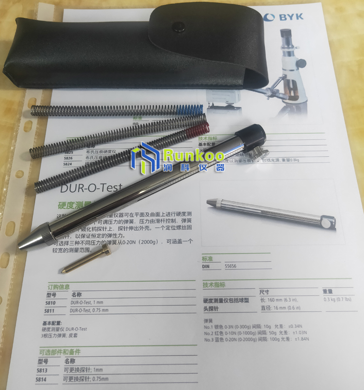 德國BYK DUR-O-Test 5810/5811硬度測量儀 基本配置: 1、 BYK DUR-O-Test測試儀筆一支; 2、 BYK DUR-O-Test測試探針一個:5810型或5811型; 3、 硬度測量儀 DUR-O-Test 3根壓力彈簧: 1號:銀色 0-3N (0-300g) 間隔:10g; 2號:紅色 0-10N (0-1000g) 間隔:50g; 3號:藍色 0-20N (0-2000g) 間隔:100g ; 4、 便攜式保護皮套一個; 5、 儀器說明書一份。