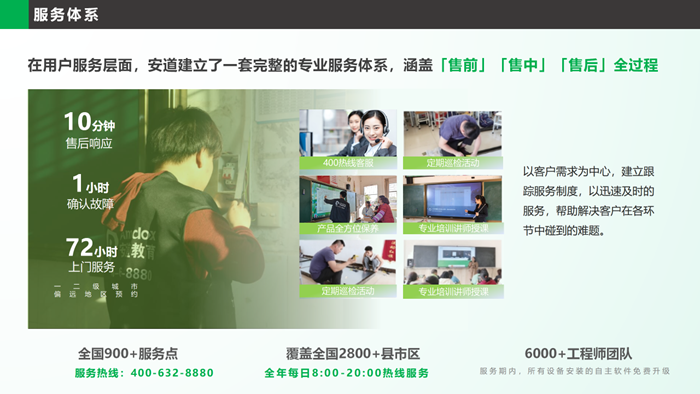 在用戶服務層面,安道建立了一套完整的專業服務體系,涵蓋「售前」「售中」「售后」全過程。當前,安道教育在全國各地建立了900+個服務點,擁有6000+工程師團隊、服務網絡覆蓋2800+縣市區。服務工程師接到報修信息后,10分鐘售后響應,1小時確認故障、72小時上門服務(一二級城市、偏遠地區預約),及時響應只為給師生帶來更滿意的教學體驗。