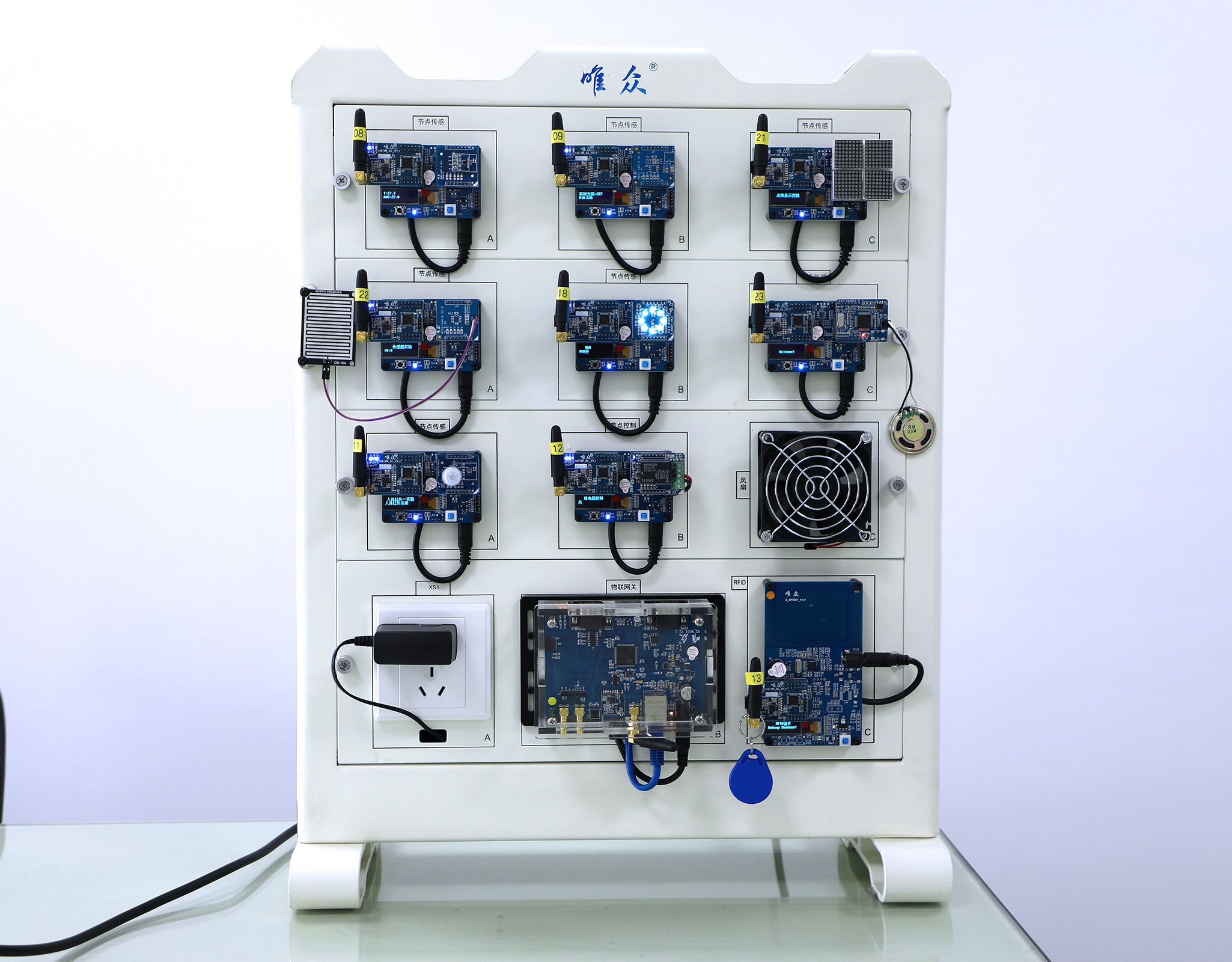 2)唯眾實訓模塊:采用工業級高精度傳感器、執行器,涵蓋采集模擬量/數字量等多種傳感采集技術,基于行業的具體應用進行功能模塊的設計,提供完整的硬件驅動層、網絡傳輸層、協議轉換調試等教學實訓內容;