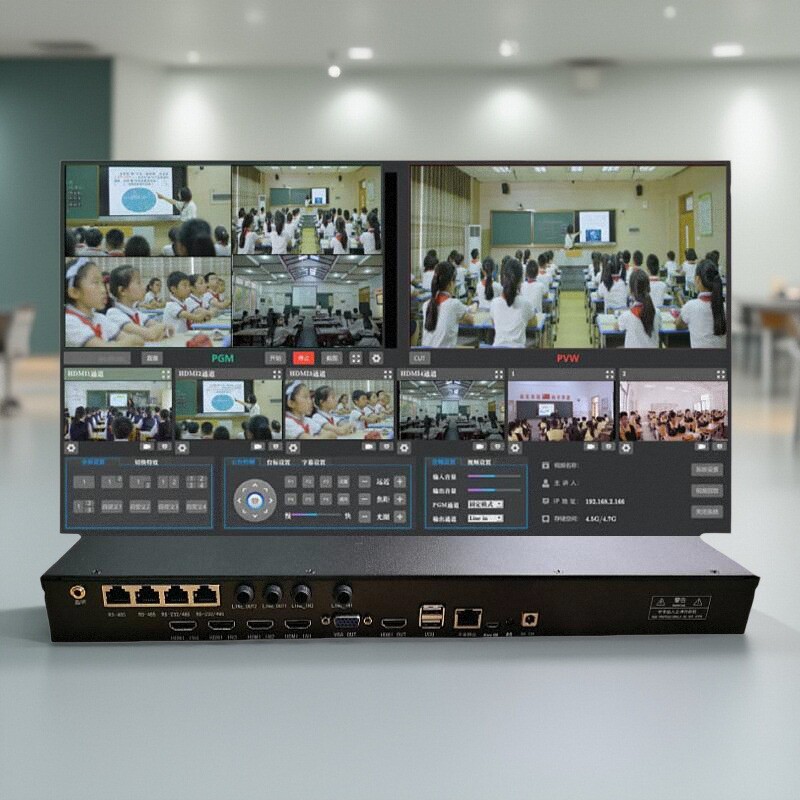 產品特色:  系統嵌入式 Linux SOC 架構  支持接電開機全自動運行直播錄制功能 7x24 小時  支持 HDMI 接線視頻和 IP 網絡攝像機流混合輸入  支持開機自動錄制,一鍵全通道視頻錄制,資源模式、電源模式錄制,錄制文件自動分段保存  支持 PGM 分屏混音功能  支持 HDMI\\VGA_OUT 輸出可選 1 至 6 通道畫面、操控界面、預覽畫面、PGM 合成畫面  支持單畫面、畫中畫、1/2/3/4/5/6 分屏功能,可點通道源的 1 2 3 4 數字快速自由組合分屏功能  支持無縫視音頻切換、淡入淡出切換、多種特效切換;支持單畫面與單畫面切換、單畫面與畫中畫或 1/2/3/4/5/6 分屏切換、支持分屏與分屏切換功能。  支持雙流不同設置碼率、幀率、分辨率直播輸出;支持同時多協議多平臺直播輸出  支持全通道視頻 6+1 路(支持4路HDMI+2個網絡流),RTMP 推本機內嵌直播分發服務器,進行跨網段大并發直播輸出  支持攝像機云臺控制  支持搭配跟蹤攝像機,實現自動跟蹤、自動切換功能  支持本地屏幕+usb 鼠標控制,遠程網絡電腦/平板 Win 客戶端控制,Web 瀏覽器控制、中控服務器/中控臺控制……