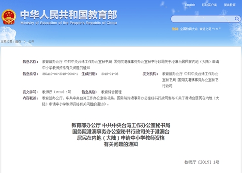 通知稱,港澳臺居民申請參加中小學教師資格考試、認定中小學教師資格的有效證件為港澳臺居民居住證、港澳居民來往內地通行證、五年有效期臺灣居民來往大陸通行證。