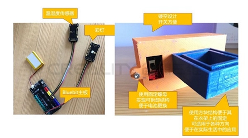 實時溫濕度提示器模型由3D打印機打印而成,只需要在建模的時候,提前為你要鋪設的電路板預留空間,打印出來就可以直接將電路板卡在里面,每個電子零件,3D打印機都為他打印好了置放的空間,有了3D打印機,安裝這個溫濕度提示器就輕松多了。