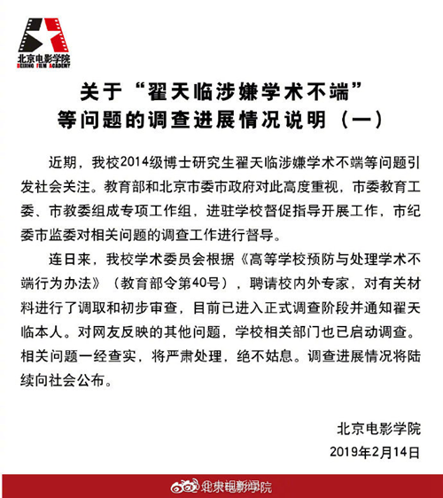 北京電影學(xué)院公布翟天臨事件調(diào)查最新進(jìn)展