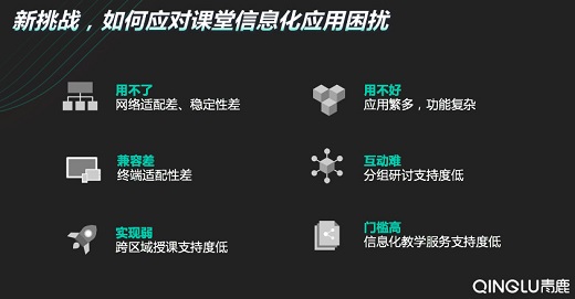 雖然課室配備了各式各樣的信息化設備,但是從實際教學開展過程中,包括從大量用戶的反饋中青鹿了解到,“用不了、用不好、兼容差、互動難、實現弱、門檻高”成為當前課堂實踐中的6大痛點。