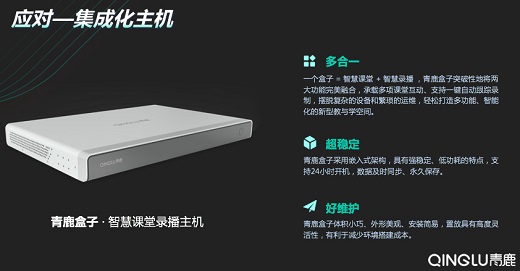 首先,在核心產品的設計上,青鹿團隊遵循“少即是多”的理念,以清新簡約的極簡界面打造極致用戶體驗,突破性地提出了“一個盒子 = 智慧課堂 + 智慧錄播”的創新概念,自主研發智慧課堂錄播主機——青鹿盒子,其具有強穩定,低功耗的特點,無需專人維護。同時,它體積小巧,有利于減少環境搭建成本,創設智能化教學環境更加簡便。