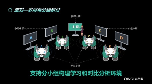 在多屏研討的教學場景下,教師通過課堂分組,實現課堂當中的三屏互動,讓每個小組成員自由分享學習成果,構建小組探究、自主學習的智慧學習環境。