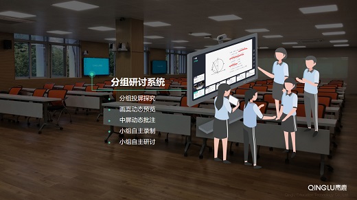 首先,青鹿高校智慧教室整體解決方案中的分組研討系統支持分組投屏探究,可輕松實現畫面動態預覽、中屏動態批注、小組自主錄制、小組自主研討等功能;